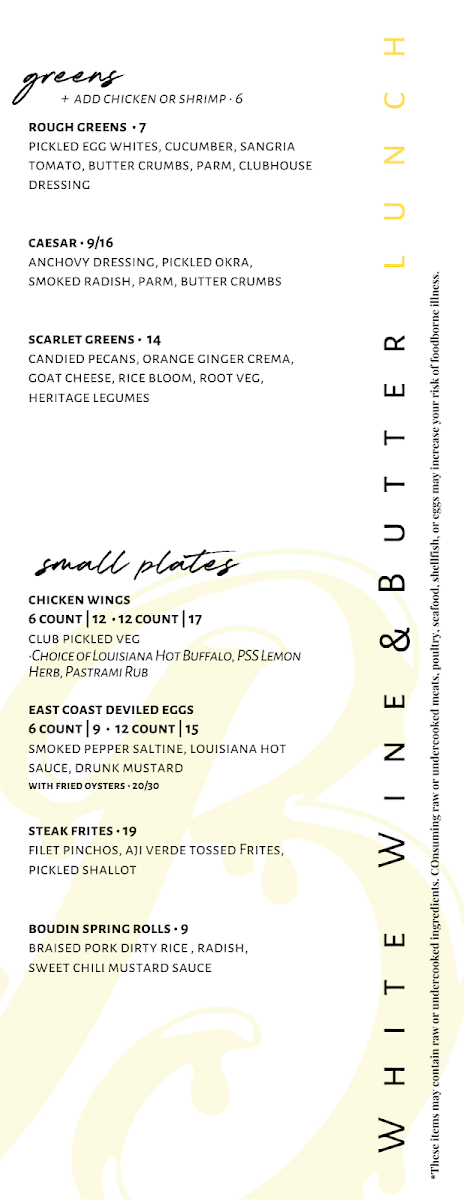 The White Wine & Butter @ Greer Golf Menu offers a thoughtful blend of Southern comfort and refined culinary craftsmanship, set against the scenic backdrop of the Greer Golf course at 2299-A Gap Creek Rd, Greer, SC. This dining experience feels both relaxed and elevated-a perfect reflection of the restaurant’s name, which evokes richness, warmth, and a touch of indulgence. Each section of the menu feels like a chapter in a story of flavor, thoughtfully designed for golfers, locals, and food enthusiasts who appreciate quality ingredients prepared with creativity and care.